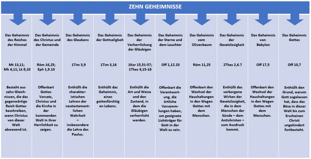 Im Neuen Testament gibt es eine Reihe von Hinweisen auf diese „Geheimnisse“. Das Wort im griechischen Text (mysterion) kommt etwa 27- oder 28-mal vor und hat Bibellehrer dazu veranlasst, sie in Kategorien einzuteilen. Einige sprechen von sieben Geheimnissen, andere von zehn, wieder andere von zwölf, vierzehn, siebzehn usw. Die Meinungsverschiedenheiten darüber, wie viele es wirklich sind, rühren daher, dass nicht berücksichtigt wird, dass in einigen der Bibelstellen von demselben Geheimnis die Rede ist, jedoch mit leicht unterschiedlichen Formulierungen. Die meisten sagen, dass es zehn Geheimnisse sind: